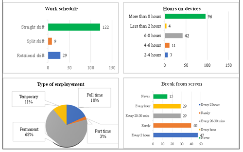 2) Work Profile: The occupational profile of the participants reveals several lifestyle and employment-related patterns that are highly relevant to the development of Computer Vision Syndrome (CVS). A majority of respondents (76%) were engaged in straight shift work, suggesting long, uninterrupted hours in front of screens. Only 18% worked rotational shifts, and 6% were in split shifts, which may offer marginal variations in screen exposure. Extended, continuous work shifts are a known risk factor for both visual strain and musculoskeletal fatigue, particularly in environments lacking ergonomic support or regulated break schedules.