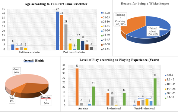 The demographic profile of the study sample on Occupational Health and Injury Risk in Cricket Wicketkeepers offers valuable insights into the diversity and experience distribution of the 160 participants. A significant majority were part-time cricketers, predominantly between the ages of 16 and 30 years, indicating a young and semi- professional player base. In contrast, full-time cricketers were comparatively fewer and largely belonged to the younger age brackets (16–25 years), highlighting a possible transition phase between amateur and professional engagement. The playing experience distribution reveals that amateur players dominate the cohort, especially those with 1–5 years of experience (41 participants). Among semi-professionals, 5.1–10 years of experience was most common, while professional players showed more distributed experience, ranging from 1 to 15 years. This suggests that higher levels of play are associated with broader experience ranges, but relatively fewer participants at elite or prolonged competitive levels. When analyzing the reason for choosing wicketkeeping, 62% cited natural talent, while 38% attributed their skills to training/coaching. This distribution reflects a mix of instinctive ability and structured development, which could influence both performance and susceptibility to injury. In terms of self-assessed overall health, 66% reported good health, 26% excellent, and only 8% fair, indicating a generally healthy population, though possibly underreporting of musculoskeletal discomfort due to perceived athletic norms.