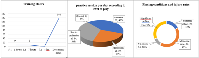 Environmental conditions also play a notable role: 42% of respondents agree that playing conditions have a moderate effect, while 31% report a significant effect on injury rates Figure 3. Factors like hard or uneven pitches, poor weather, and inadequate drainage likely contribute to sprains, strains, and overuse injuries, especially during matches with extended durations.