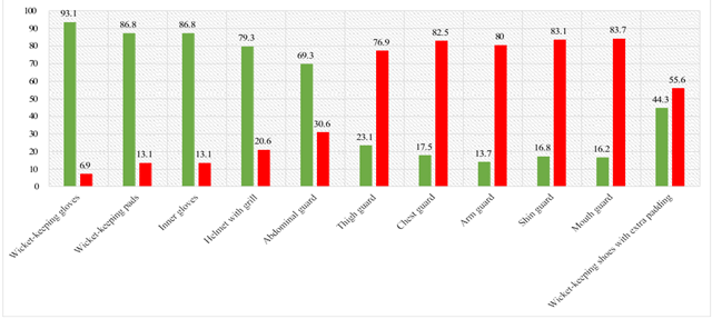 Finally, usage of protective gear shows that while gloves, pads, and helmets are widely adopted (above 79%), low uptake is observed for crucial injury-preventive gear like chest guards (17.5%), arm guards (13.7%), shin guards (16.8%), and wicketkeeping shoes (44.3%) Table 2. Inadequate protective coverage across vulnerable body parts exposes wicketkeepers to both impact and overuse injuries, particularly in amateur and semi-professional play where equipment access may be limited.
