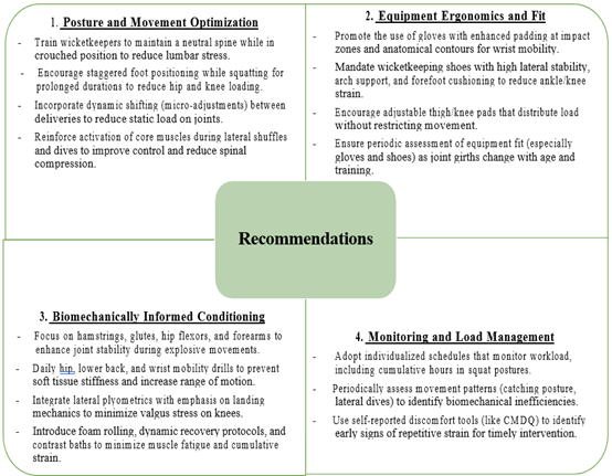 These recommendations should be implemented in wicketkeeper-specific injury prevention programs, co-developed with physiotherapists, sports scientists, and equipment designers to reduce injury risk and support long-term occupational health.