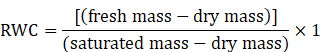 The fresh weight of top 5th and 6th leaves from each treatment was recorded. The leaves were then immersed in distilled water in beakers and left for 24 h. Thereafter, fully turgid leaves were weighed again. The leaves were dried in oven for 72 h at 70 ºC, until constant weight of leaves was obtained. Relative water content (RWC) of leaves was calculated according to Wheatherly (1950).
