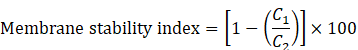 Membrane stability index (MSI) was determined by recording the electrical conductivity of leaf leachates in double distilled water at 40 and 100°C Sairam (1994). Leaf samples (0.1 g) of top 5th and 6th leaves were cut into discs of uniform size and taken in test tubes containing 10 ml of double distilled water in two sets. One set was kept at 40°C for 30 min and another set at 100°C in boiling water bath for 15 min and their respective electric conductivity’s C1 and C2 were measured by conductivity meter.