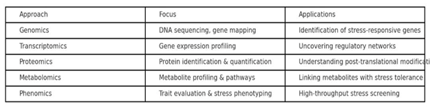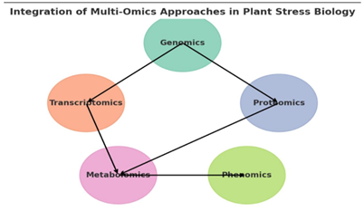 Integrative omics has emerged as a transformative tool for understanding and improving plant stress tolerance. By combining genomic, transcriptomic, proteomic, metabolomic, and phenomic data, researchers can construct a comprehensive systems-level view of stress responses. While challenges persist in data integration, computational modeling, and field validation, the synergy of omics with genome editing, AI, and precision agriculture holds great promise. These strategies will not only enhance crop productivity but also contribute to global food and nutritional security under the looming threat of climate change.