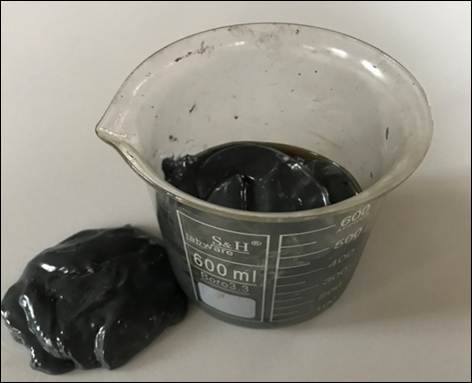 For the abrasive medium used in AFM, silicon carbide (SiC) powder with an average particle size of 240 mesh was chosen as the abrasive phase because of its high hardness and stability during repeated flow cycles. The abrasive particles were mixed with a viscoelastic polymer carrier and hydraulic oil to form a paste-like, semi-solid medium with sufficient viscosity to transmit pressure uniformly through the specimen channels. The mixture was prepared carefully to achieve a homogeneous distribution of SiC particles within the polymer base, ensuring consistent material removal throughout the process. The final appearance and texture of the prepared AFM media are illustrated in Figure 1.