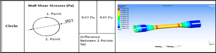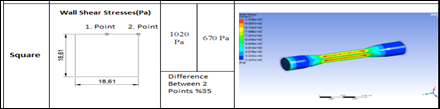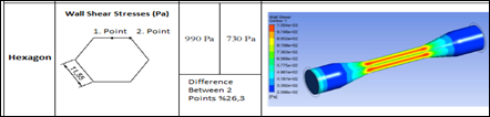 Evaluating results, Figure 4, for the circular channel, the wall shear stress values were found to be 849 Pa at both the first and second measurement points, resulting in a 0% difference between the two. This indicates that the abrasive flow was uniformly distributed along the inner surface, showing a stable and symmetrical velocity profile. The absence of sharp edges allowed the medium to maintain a consistent shear force across the circular section, leading to homogeneous material removal and an even surface finish. In the square channel, Figure 4, the wall shear stress measured 1020 Pa at the first point and 670 Pa at the second point, yielding a 35% difference between the two regions. This considerable variation suggests that the flow velocity decreased significantly near the corner areas, where the abrasive medium likely experienced stagnation zones. Consequently, the material removal efficiency in these regions would be lower, indicating that the AFM process becomes less effective near sharp edges or corners. For the hexagonal channel, Figure 4, the wall shear stress values were 990 Pa and 730 Pa, corresponding to a 26.3% difference between the two points. Although the variation is less than that of the square geometry, it still demonstrates an uneven distribution of shear stress. The multiple corners in the hexagonal shape caused partial flow deceleration, leading to less contact between the abrasive particles and the wall surface in these areas.