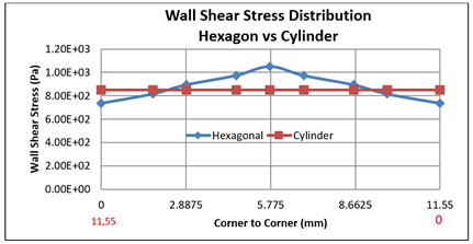 Figure 6 Wall Shear Stress Distribution Hexagon vs Cylinder |