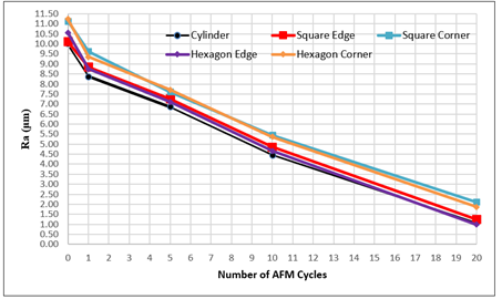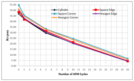 After 20 cycles, the average roughness (Ra) was reduced by ≈90% for the cylindrical samples, ≈88% at the square edges, ≈81% at the square corners, ≈91% at the hexagonal edges, and ≈83% at the hexagonal corners. The Rz values followed the same pattern, with reductions of about ≈91%, ≈91%, ≈88%, ≈92%, and ≈89%, respectively. These improvements indicate that surfaces with smoother and more continuous flow paths such as cylindrical and edge regions benefited the most from uniform abrasive action during the AFM process.