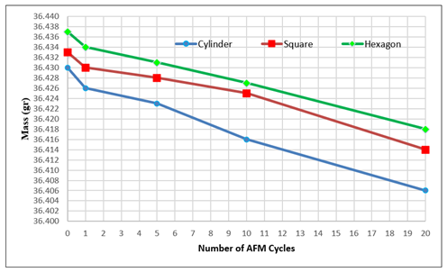 The variation of the Material Removal Rate (MRR) over the course of the AFM process is illustrated in Figure 9, showing how the specimen mass changes with the number of processing cycles for the cylindrical, square, and hexagonal geometries. As seen in the figure, all samples experience a steady decrease in mass as the number of AFM cycles increases, confirming that continuous material removal takes place throughout the process. However, the rate of this removal is not constant—it is initially high and gradually slows down as the surfaces become smoother and more refined.