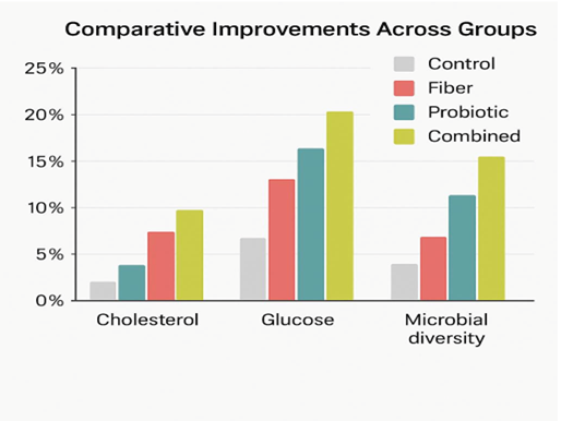 Figure 1 (below) graphically depicts the comparative improvement across intervention groups, illustrating the additive and synergistic effects of combining dietary fiber with probiotics.