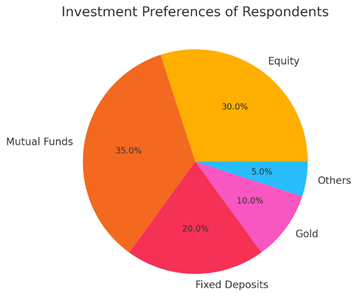 The pie chart shows the proportional distribution of respondents’ investment choices across five categories: equity, mutual funds, fixed deposits, gold, and others. Mutual funds form the largest share at 35%, indicating that most investors prefer professionally managed and diversified portfolios.