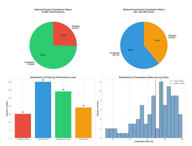As the mission approaches its original 2020 completion deadline (subsequently extended), questions about implementation efficacy have become increasingly urgent. While numerous studies have examined individual smart city projects or specific thematic areas, there exists a critical gap in comprehensive, nationwide analysis of implementation outcomes across the entire portfolio of 100 cities. This study addresses that gap by analyzing project-level data covering all 100 smart cities, encompassing 7,983 projects with a cumulative investment of Rs. 181,490 crore as of July 2023.
