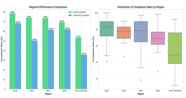 Regional analysis reveals stark disparities in implementation outcomes across India's geographic regions. Table 1 presents comprehensive regional statistics, while Figure 2 visualizes these patterns.