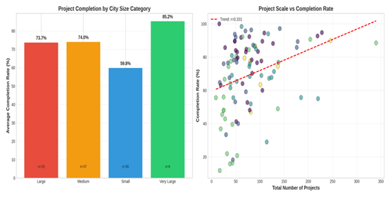 · Scale Effects: Cities with larger project portfolios demonstrate higher completion rates, suggesting economies of scale in capacity development.