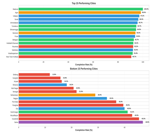 Completion rates demonstrate substantial variation, ranging from 11.8% (Shillong, Meghalaya) to 100% (Madurai, Tamil Nadu)—an 88.2 percentage point spread. The mean completion rate is 69.4% with a standard deviation of 21.6%, while the median stands at 76.0%, suggesting a slight left skew in the distribution with more cities performing above the mean than below it.