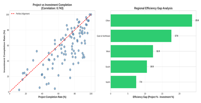 We analyze the divergence between project completion and investment completion rates to understand the 'investment-implementation paradox' and its implications for project design and execution.