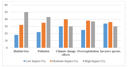 The evidence shows that loss of habitats and pollution were the most eminent anthropogenic pressures and more percentage of observations lay within the high impact category. The effects of climate change and invasive species were more evenly distributed in the impacts across the levels of influence whereas overexploitation demonstrated moderate to high levels of impact. In general, the table indicates a significant difference in degree of human pressures throughout the study area.