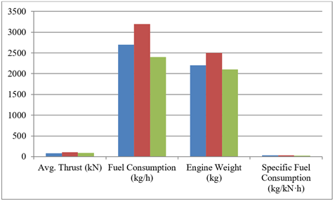 Table 1 and Figure 1 indicate that turbofan engines were the ones with the highest average thrust at 110 kN and the highest fuel consumption at 3200kg/h but the specific fuel consumption is the highest at 29.1 kg/kN•h. The turbojet engines produced an average force of 85 kN with a fuel consumption rate of 2700 kg/h and specific fuel consumption rate of 31.8 kg/kN•h, which was less efficient than a hybrid-electric engine. The average thrust produced by the hybrid-electric engines was 90 kN, and the minimum fuel consumption was 2400 kg/h and the peak specific fuel consumption was 26.7 kg/kN•h . These differences are visually highlighted in Figure 1 with the hybrid-electric engine being the most fuel efficient, turbofan engines having the highest thrust production, and turbojets being moderate. These control figures give an easy benchmark of the effect of the new design and optimization measures on engine efficiency.