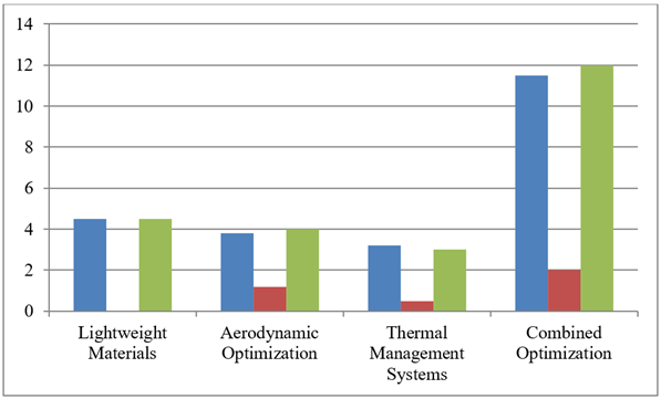 Table 2 and Figure 2 show that all the design interventions led to some improvements in fuel efficiency. The materials made lightweight saved 4.5% of fuel, aerodynamic optimization gained 4.0% of efficiency and a slight enhancement in thrust, and thermal management systems gained 3% of efficiency. The 12.0% overall improvement implemented as a result of the combination of all interventions shows the synergistic effect. As demonstrated in Figure 2, the combination of optimization strategy was the most efficient, and it is important to point out that a combination of several design enhancements is essential to optimize the fuel efficiency of aero engines.