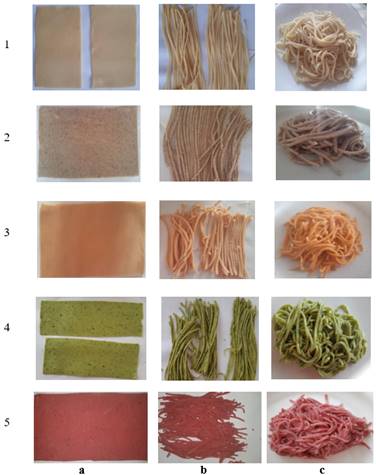 before and after boiling a-rolled dough; b-noodles before boiling; c-noodles
