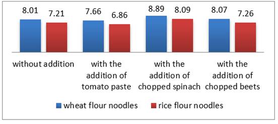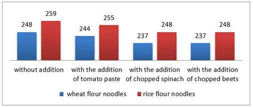 Compared to wheat flour noodles, brown rice noodles have the following characteristics: boiling time with 60% lower (5 minutes), volume after boiling with 20% lower, energy value with 4% lower (259 kcal/100 g), nutritional value indices with 10% lower (VN10=7, 21) and cost price 4 times higher (54.03 lei/kg). The addition of spinach contributes to an increase in nutritional value by 11% and the addition of tomato paste to a decrease in nutritional value by 11% and the addition of beets contributes to an increase in nutritional value by 0.7%.