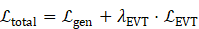 The total loss function for training the EVT–DGM framework is a weighted combination of the generative loss and the EVT-based tail penalty: