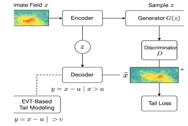 Deep Generative Models (DGMs) such as Variational Autoencoders (VAEs) and Generative Adversarial Networks (GANs) have gained attention for their ability to learn latent probabilistic structures and generate realistic high-dimensional samples Kingma and Welling (2014), Goodfellow et al (2014). In climate science, VAEs have been used for anomaly detection Arjovsky et al. (2017), while GANs have been applied to precipitation downscaling and synthetic weather generation Vandal et al. (2017). Nevertheless, standard DGMs are not explicitly designed to model rare extremes and tend to underrepresent tail behavior.