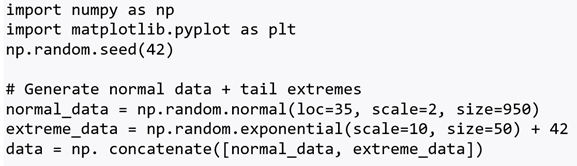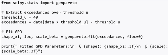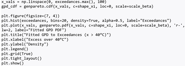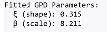 Using a simulated dataset of daily maximum temperatures, a threshold of u=40^∘ C was selected based on the 95th percentile. The Generalized Pareto Distribution (GPD) was fitted to the exceedances, yielding: