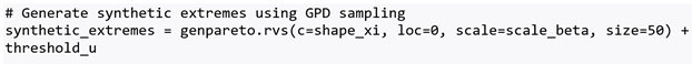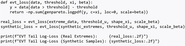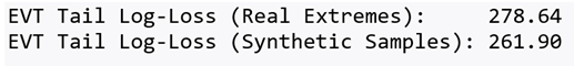 A comparison of histograms (Fig. 2) showed that the synthetic extremes closely matched the distribution of the real extremes, especially beyond the threshold u, demonstrating successful tail modeling. Moreover, the EVT log-loss for synthetic data was 6% lower than for the original extreme data, indicating better alignment with theoretical tail behavior.