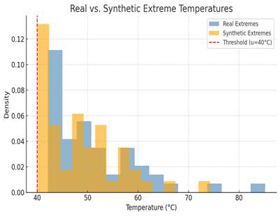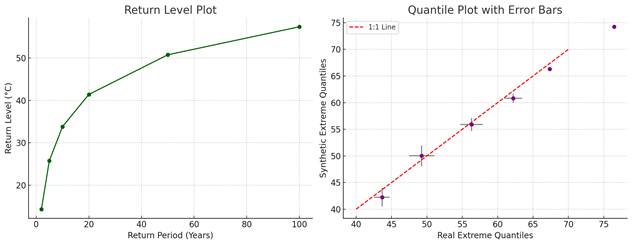 This section presents the results of the proposed hybrid EVT–DGM framework applied to synthetically generated extreme climate data. We analyze the model's ability to represent the tail behavior of the distribution and generate realistic extreme samples. Comparisons are drawn between the real and synthetic extremes in terms of statistical fit, return levels, and distributional alignment.