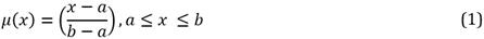 · An input value between a and "b" will have a membership value from 0 to 1, the closer the value is to b, the higher its membership value. eq. 1 shows the computation of this condition.