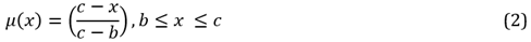 An input value between b and “c” will have a membership value from 0 to 1, the closer the value is to b, the higher its membership value, eq.2 shows the computation of this condition.