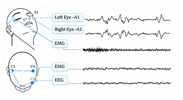 Polysomnography (PSG), considered the gold standard in the diagnosis of sleep disorders, enables the simultaneous recording of physiological parameters occurring in the human body during sleep. Through this test, the biological processes of an individual are examined in detail, providing valuable information about sleep stages and wakefulness patterns. In this method, the sleep process is first divided into epochs, which are subsequently scored for analysis. These stages are typically identified through the analysis of electroencephalography (EEG), electrooculography (EOG), and electromyography (EMG) signals, as illustrated in Figure 2, Köktürk (2013).