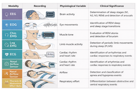 typically conducted in sleep laboratories Mendonca et al. (2018). Polysomnography involves the recording of
