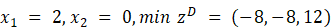 x1 = 2, x2 = 0, min zN = (−10, −4, 16). Equation 8